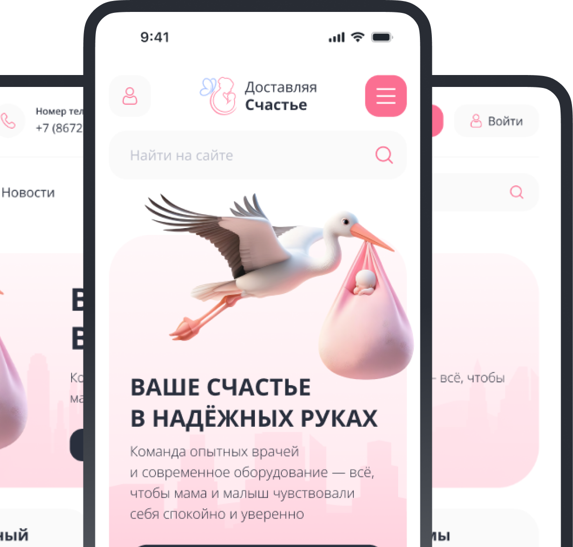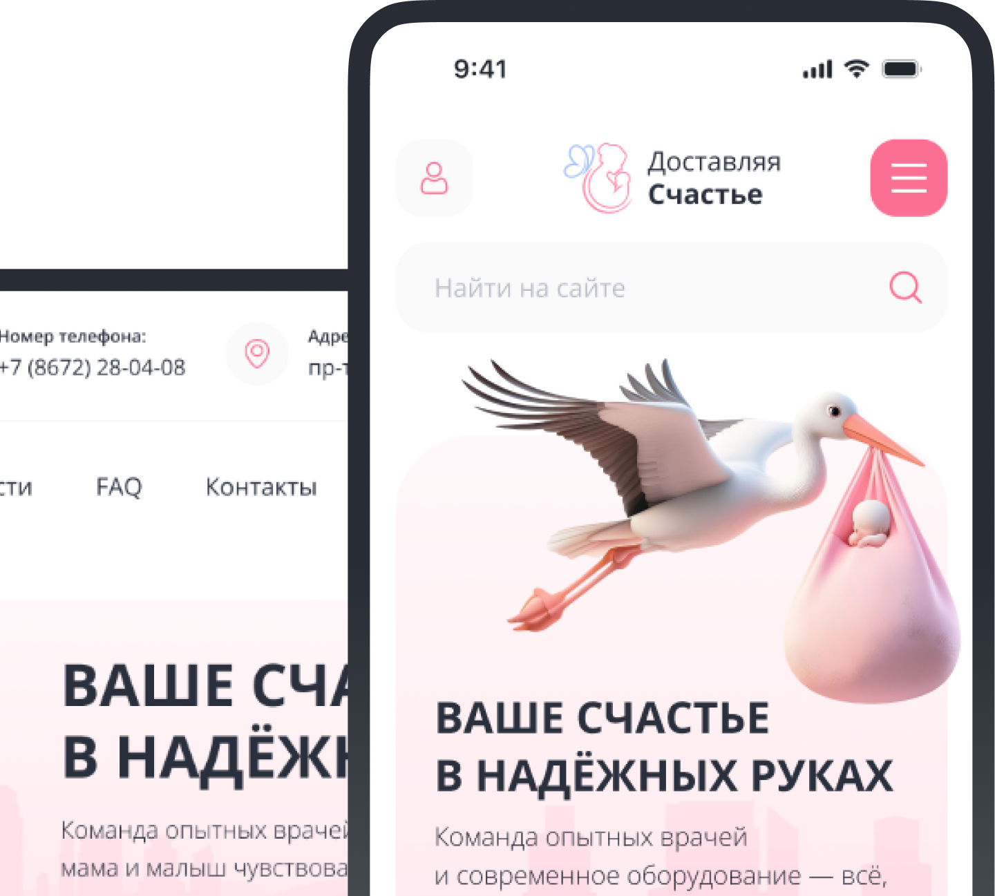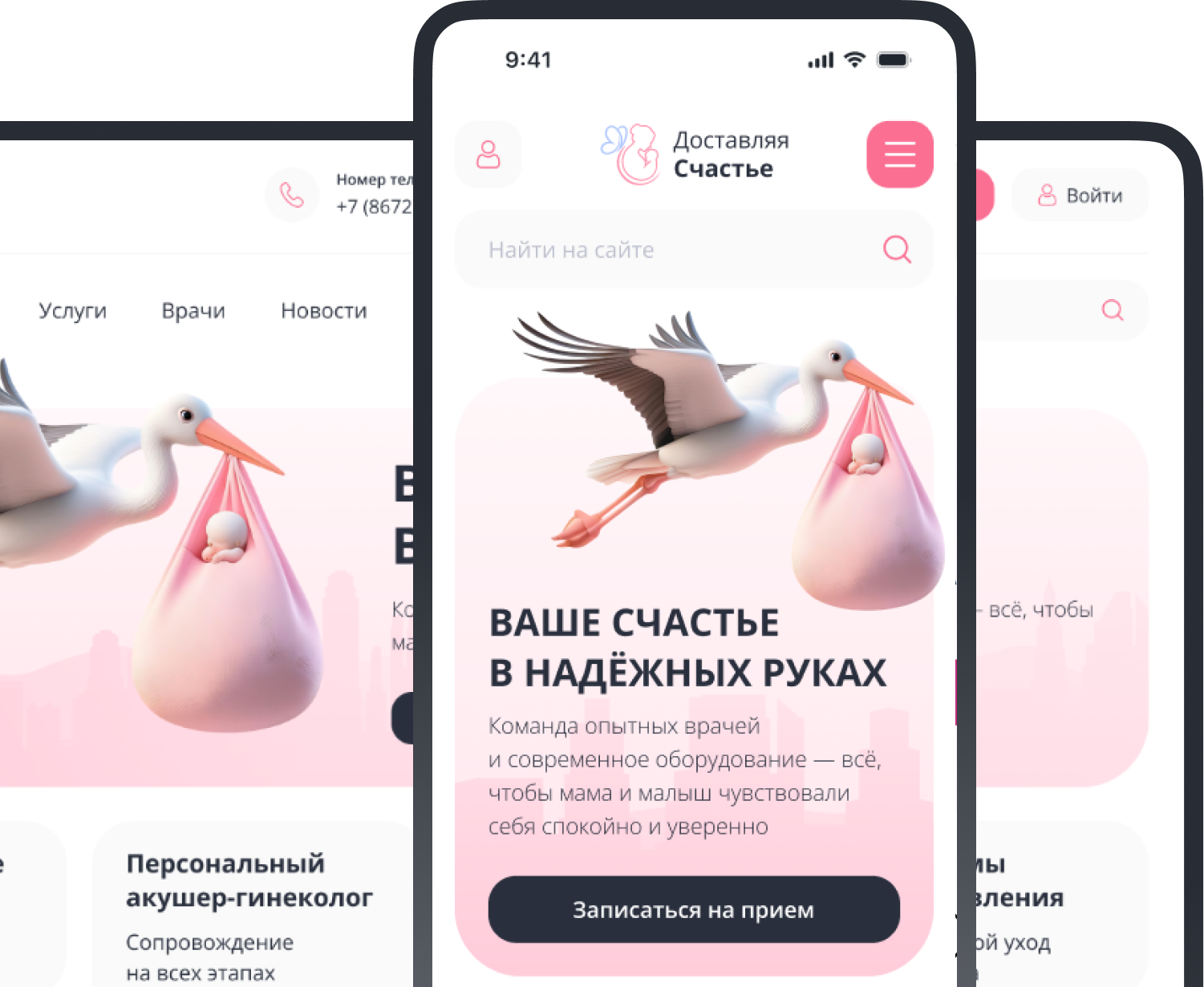 Разработка сайта для частного родильного дома «Доставляя счастье» — клиентский портал с интеграцией CRM-системы. Пациентам доступны: онлайн-запись на приём к врачам, личный кабинет для будущих мам с историей наблюдений и доступом к медицинским документам. Адаптивная вёрстка обеспечивает удобство использования на всех устройствах.